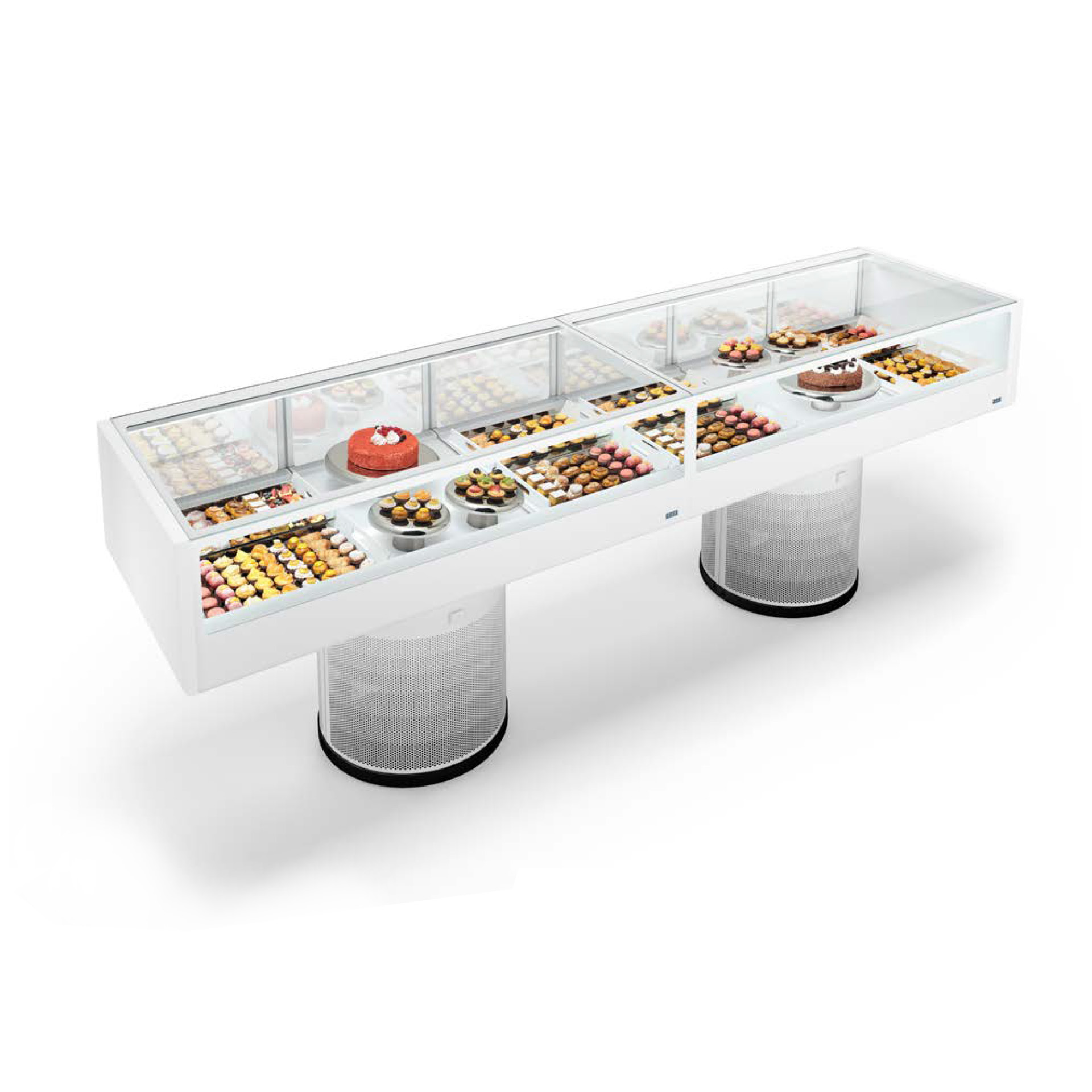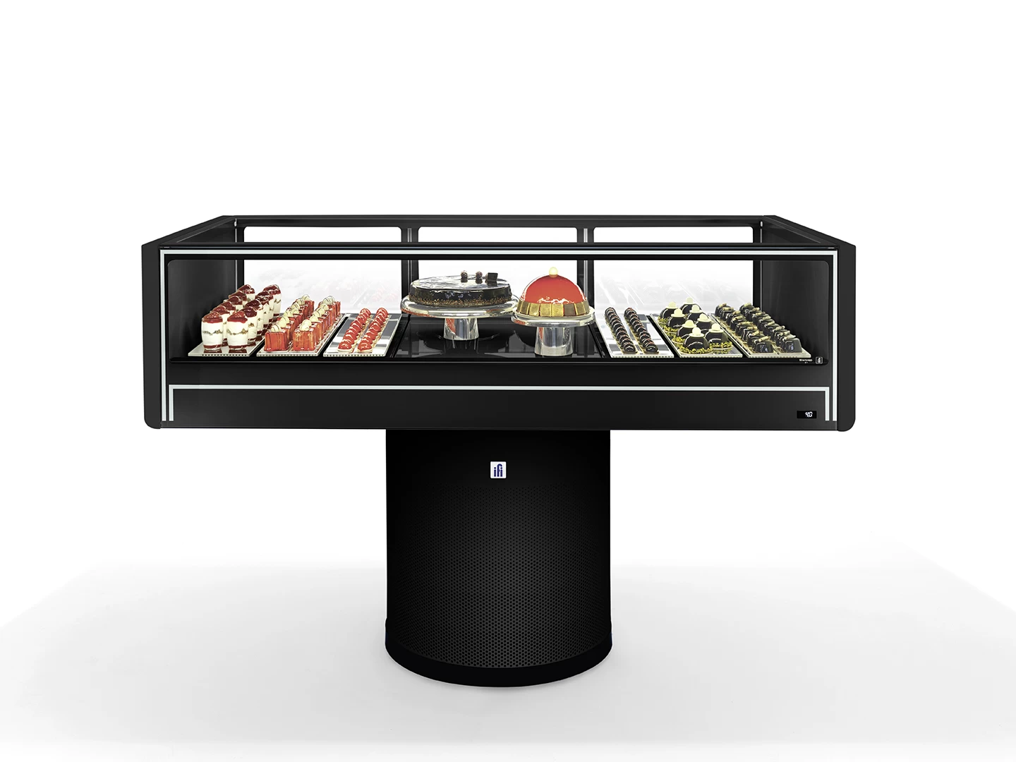 La Vitrina IFI Colonna es una pieza central en cualquier espacio de exhibición de pastelería. Su diseño único en el que forma y función se unen, ofrece una experiencia visual y de sabor sin igual, libre de pesos y estructuras superiores, creando una isla iluminada donde la excelencia artesanal se encuentra con el deseo del cliente.