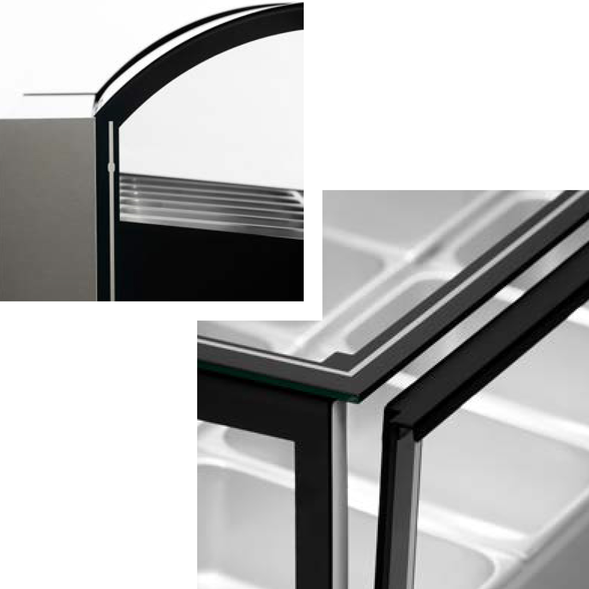 La Vitrina Milia dispone de un marco de vidrio autoportante, con vidrio frontal grande y doble acristalamiento que asegura una aislación térmica excepcional. Las puertas correderas del lado del operador cuentan con un sistema de cierre HCS y sellos semiherméticos que minimizan la entrada de aire externo.