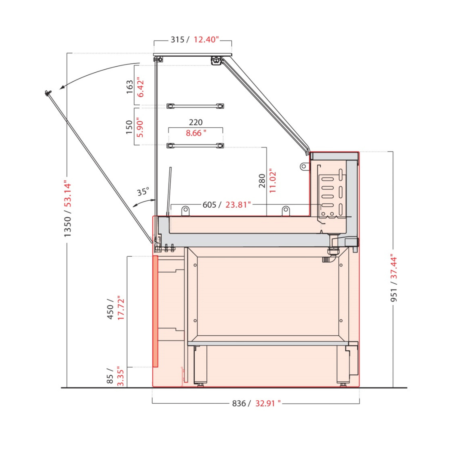 Con un ancho de 59.6″ y una altura de 53.14″, la Vitrina IFI Mix ofrece una superficie de exposición en acero inoxidable y dos estantes de vidrio, perfecta para exhibir una amplia gama de delicias culinarias.